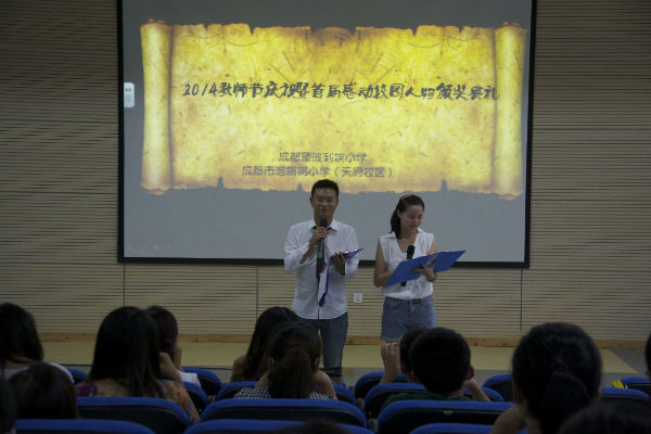 三十弦歌,桃李芬芳,金秋九月,硕果飘香。2014年9月10日迎来了第30个教师节,在这个特殊的节日里,成都市泡桐树小学(天府校区)和蒙彼利埃小学全体老师在二楼阶梯教室隆重集会,开展了以“三十弦歌,桃李芬芳”为主题的教师节庆祝活动暨首届感动校园人物评选,以此庆祝属于我们自己的节日。