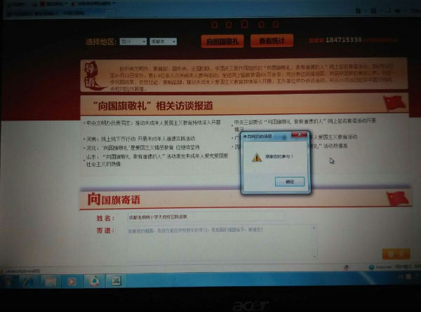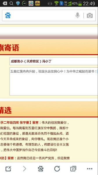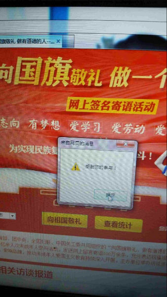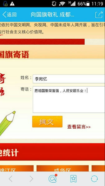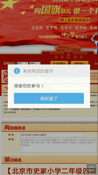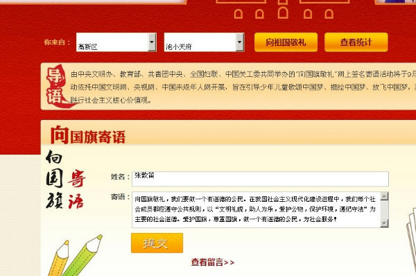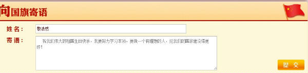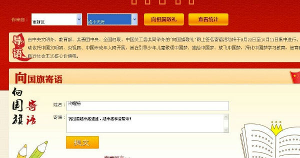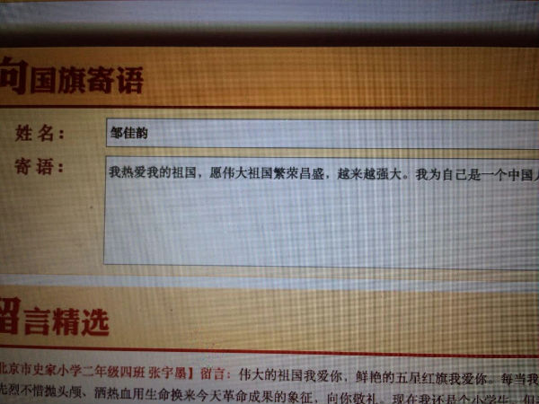 下周三我们就将迎来建国以来第六十五个国庆节,在祖国母亲生日来临之际,我们二年级的小泡泡们积极踊跃地参与“向国旗敬礼”网络签名活动,同时还写下了自己对祖国的祝福。
