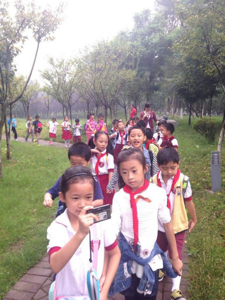 秋天,是丰收的季节,也是色彩缤纷的季节,为了让孩子亲近大自然,同时体验生活中的乐趣,善于探索和发现,2014年9月30曰,泡小天府组织一、二年级的孩子此次锦城公园游园游学活动。 成都锦城公园就象座落在繁华都市中一颗碧绿的明珠,公园内草木葱郁,湖水荡漾,今天,在小雨的浸润下显得更加生机勃勃。 我们二、四班的小朋友在班主任和副班主任老师的带领下,与年级其他老师和同学井然有序地沿着弯弯曲曲的小路行进着。天空不时飘着小雨,老师们很担心孩子被淋坏了,不时提醒孩子戴好帽子,或是用雨具避雨,可是孩子们却一点也不在乎,反而因为这可爱的小雨而更加兴致勃勃,这也是一次有趣的游学经历。在中途避雨休息的时候,我们班的孩子有的三五个聚在一起看书,有的在做游戏,有的在唱歌跳舞,还有一个孩子在给老师捶背,是那样的温馨! 这次游学,孩子不但感受了大自然的美好风光,开阔了视野,锻炼了身体,增进了彼此间的友谊,还教育了孩子要热爱大自然,保护环境,做一名有社会责任感的小公民。