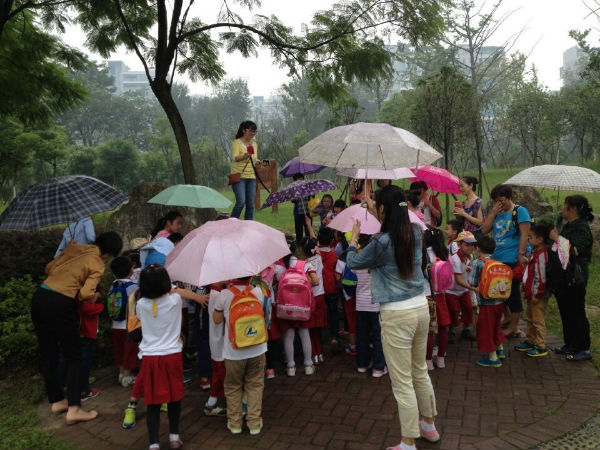 刚进入公园不久,老天洒来星星小雨,公园内草木葱郁,湖水荡漾。但是孩子们都很镇定,一点都没影响玩兴,在避雨的同时,各年级各班组织了丰富的节目,歌舞神曲联唱《小苹果》、《拉勾勾》、《美羊羊和喜洋洋》随着音乐的响起,孩子们载歌载舞,其乐洋洋?????不同形式展示了孩子们的风采,男孩子们玩起了划拳、聊天,女孩子们看书、画画,整个场景非常活跃但不失纪律。