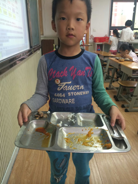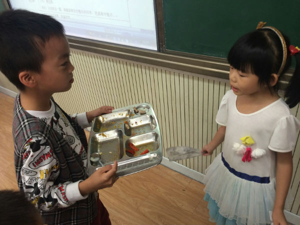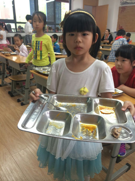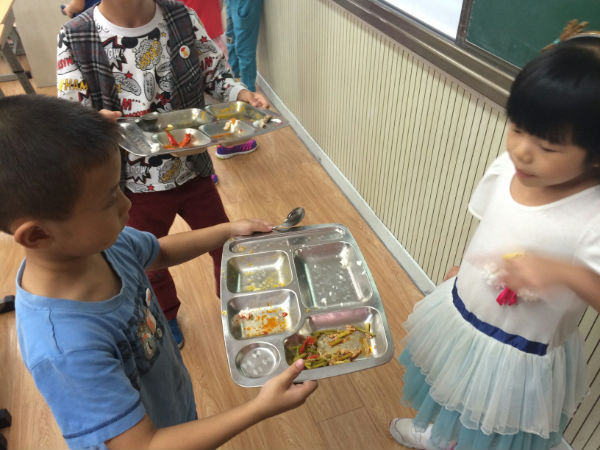 现在每天中午2.4的同学都把饭菜吃得干干净净,连放盘子和勺子的时候都静静的呢!