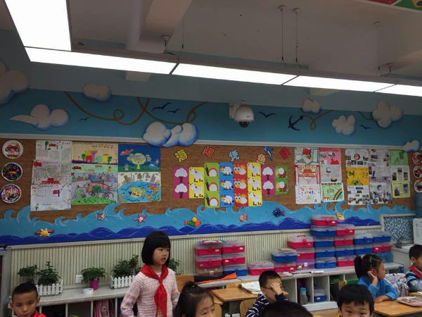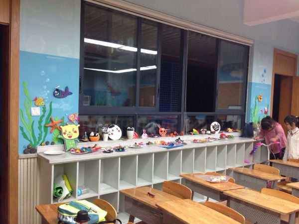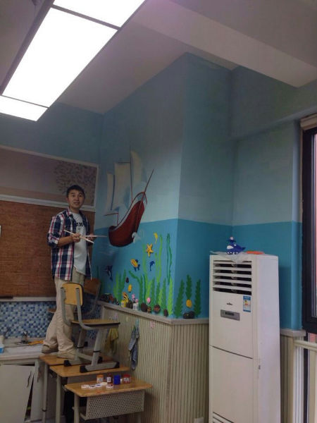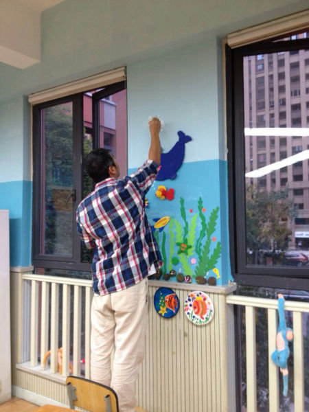 瞧,由学工程造价出身的吕妈担任总指挥,学室内装修设计出身的任妈亲自出设计图,同样也是学工程专业出身的林妈亲自指导油漆颜色的调配和主要材料的釆购,专业美术大师方爸亲自上墙绘图,甚至还有服装设计专业出身的吴妈现场反复补充完善,这个汇聚了各行各业精英的强大换装队伍就此敲定,并于国庆前夕抓紧筹备,国庆放假期间就动工粉刷了墙壁,国庆后在众多能干的泡爸泡妈们的帮忙下,展开了剪、裁、画、贴、挂一大堆看似简单,但实则复杂的精细工序,大家仍有条不紊、很有默契地进行着。特别是此次的亮点----"长青藤号游轮"壁画,在专业画家方爸的笔下简直活灵活现、生动逼真,还引来了无数围观者。最后挂上孩子们用超轻粘土亲手制作的海洋宝贝们,哇噻,一个如此美妙的海洋世界活生生地呈现在我们眼前,未来的一年,孩子们将在这里尽情畅想,尽情 遨游,活力无限!