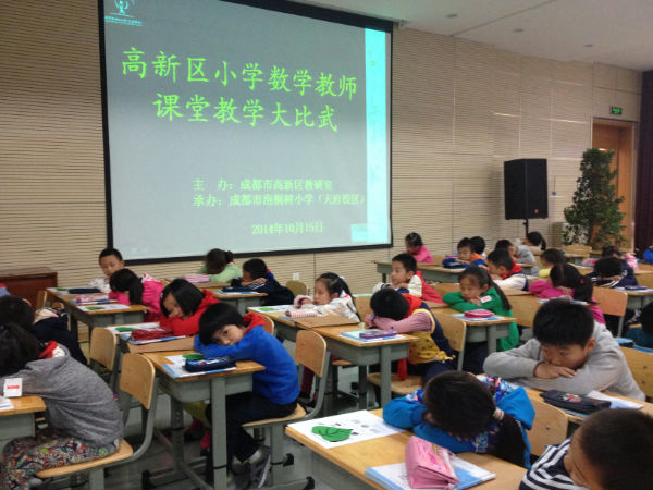 从校内初赛开始,数学组就制定了详实而周密的计划,做到“以赛促教,人人参与。”通过初赛,选出了两位颇有实力的干将——唐志国、周晓霞。唐志国成熟干练、久经赛场;晓霞初出茅庐却已锋芒毕露。后来,张利成老师的加入更加壮大、壮实了这个队伍。本次课堂教学大比武的主题是“运用几何直观促进学生数学思考”。为了吃透这个主题,选对、选好课题,赢在起点。数学组教师在游琼英主任的带领下,通过查阅大量资料、听专题讲座等方式,首先丰富每个人的专业知识,然后再群策群力为3位老师选参赛课题。所选参赛课题紧扣主题,得到了区教研员李老师的称赞,她说:“泡小天府参赛老师选的课题最能体现主题!”有了良好的开端,如何才能保证实力和水平的最大发挥呢?当然是发挥团队的优势。本次参赛老师有3人,达到历史之最。时间紧、任务重,既不能打乱正常的教学秩序,又要保证最大能力为3位选手服务。经过商议后,根据每位老师的特长,将数学组老师划分为3个团队分别为3位选手服务:有专业的写手协助理论和教案的编写、有心灵手巧的年轻女老师协助教具的制作、有经验丰富的老师协助课堂的磨练……整个数学组是热火朝天、累并快乐着!3位参赛老师也卯足了劲儿,一次又一次的修改教案,一遍又一遍的试讲,从开始的踌躇满志到不知所措,再到信心十足。为了让自己的语言更有激情,冬艺带晓霞一起请教语文老师;张利成在办公室一句一句的练习语调和表情;唐志国则向有幼儿教学经验的芶景婷请教。到赛点联系班级试讲、和孩子见面,设计打印精美的教案……虽说是3个团队,却又不分彼此。无论什么时候,你都会感觉到同伴的温暖。