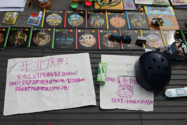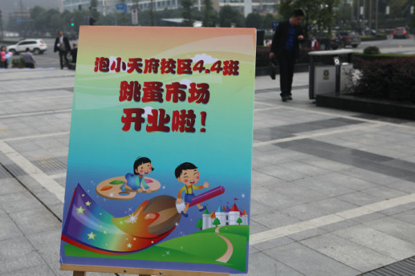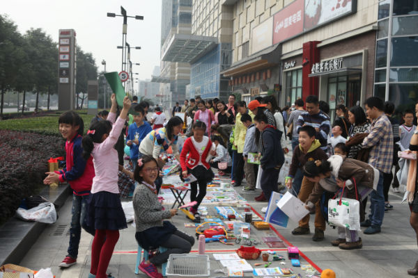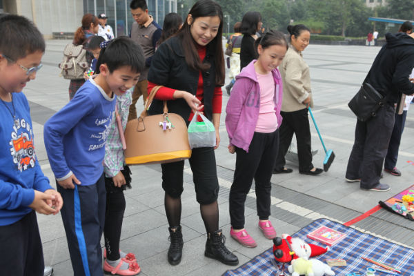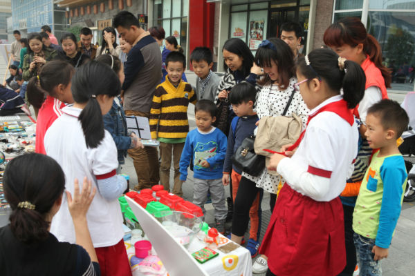 活动前期,老师和班级家委会广泛征求小朋友和家长意见,制定了详细方案,倡导全班同学都来参加活动,将自己家中闲置的书籍、杂志和小玩具、小制作、小发明、学习用品、手工艺品等拿出来售卖。为了能将活动办好,小朋友们3—4人一组,确定名称,推选小组长,进行叫卖、收银、记账等分工,还约定了售卖物品,理出价格清单,一些小组的同学甚至自己动手制作了宣传广告和口号;而泡爸泡妈们则在校门口张贴起了海报,热烈邀请全校老师同学都来参加。
