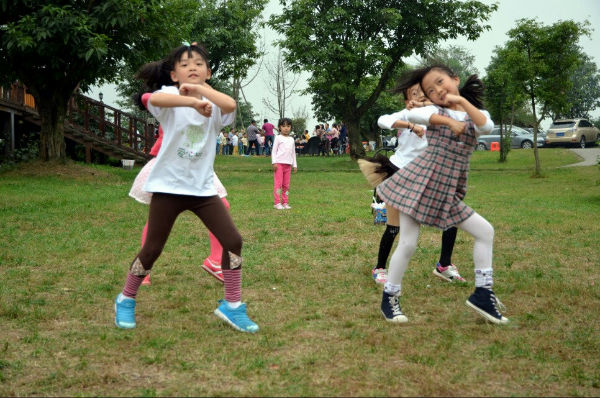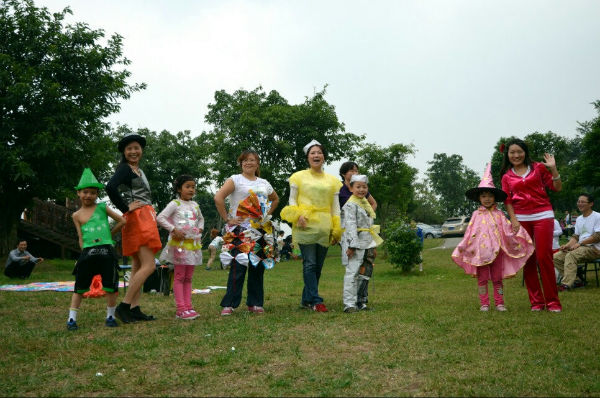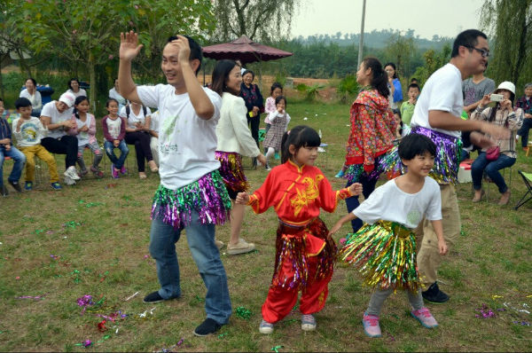 午餐后,大家围坐成大圆圈,抢报纸、滚苹果、击鼓传花、草裙舞、抢尾巴、变废为宝时装秀,游戏一个接一个,笑声此起又彼伏。