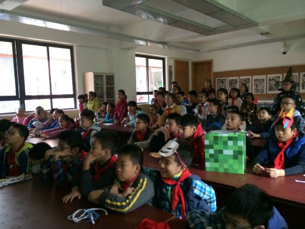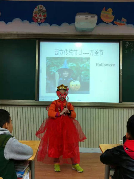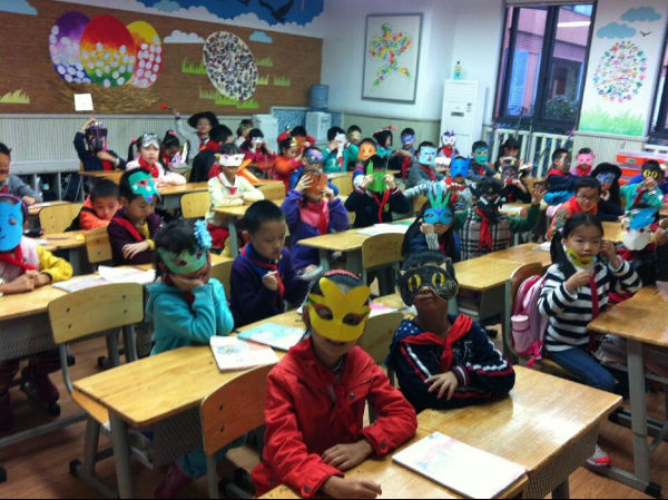 活动二:万圣节面具制作大赛。面具制作大赛可谓本次庆祝活动的高潮。周二从老师宣布这一比赛开始,小泡泡就开始摩拳擦掌,准备大显身手了。周四一大早,教室里,走廊上到处是身披黑披风,头戴魔法帽的小巫师的身影。英语课上,孩子们纷纷亮出自己的手艺--亲手设计和制作的万圣节面具,这些充满想象力和童趣的作品让大家大开眼界。大家互相交流自己的作品,获得优秀设计奖的孩子更是欢呼雀跃...