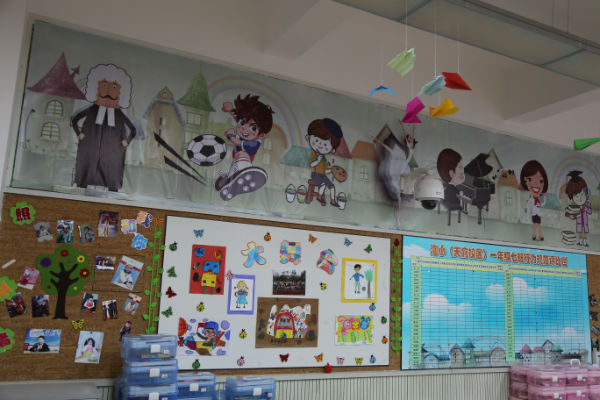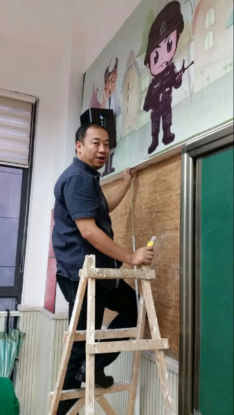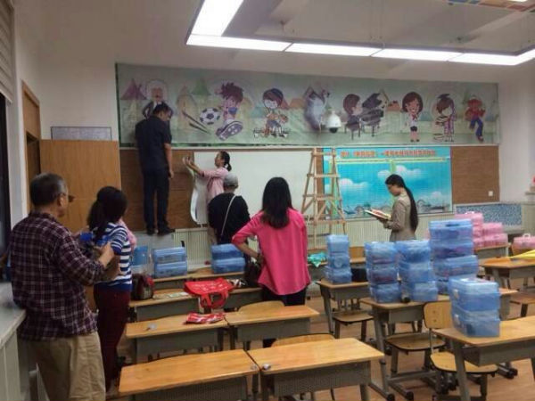 经过一番忙碌的准备,就位安装的日子终于来到了,家委会的成员和热心的泡爸泡妈们瞬间将教室变成了一块DIY的大工地。看吧,妞妞妈请来了妞爸支援和培爷等形成主力军,完成了高难度的大型喷绘安装任务,完成的效果可与专业安装公司相媲美;泡妈们也不闲着,环境整理、手绘课程表、裁剪、粘贴等,得心应手;点睛之笔的49架五颜六色的小飞机正待命起飞,每架小飞机都分别承载着我们1.7班49个小泡泡的愿望,梦想将从这里起飞。在爸爸妈妈的巧手布置下,教室里呈现出一派蓬勃朝气、温馨暖人的氛围:清新的色彩,简洁明朗的格局,丰富的画面,可亲的卡通形象。。。当我们正在贴窗纸的时候,有几名高年级的同学放学经过,情不自禁地发出感叹:“一七班好漂亮啊!”,发自内心的话语让现场的泡爸泡妈们心里格外温暖,用心付出得到了最朴实的肯定。