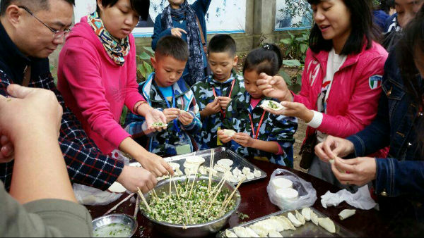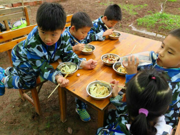 这边是神兵在带伤作战,那边是退役的老兵们做好后勤保障。我们就地取材,柴火烧红,大锅支上,饺子开包。此情此景让人很自然地想起了当初的根据地,后方的供给力量非常强大。不一会来自天南海北的各种长像的饺子在簸箕里笑得个乐翻天,以至于有的把肚皮都笑破了。雄鸡刚叫晌午,士兵们要回营吃饭了,天啦,熊孩子们折腾了一个上午,每一枚小战士干饺子的频率是每分钟2个以上。炊事班不停地催饺子兵快点包,饺子女兵们没办法,只有齐喊“孩子爹,你老婆让你回家包饺子了!”现场笑声,吆喝声,锅碗瓢盆声汇成了我们二年级八班特有的活力之声!孩子们看到家长们笑的比自己还天真,每个人都卯足了劲,再干进去一碗大水饺!
