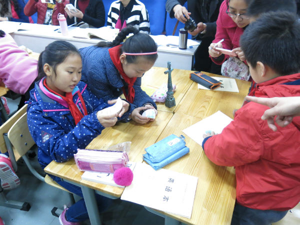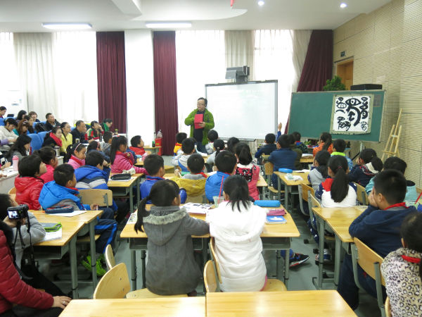 首先,由泡小天府校区邓鹭老师携三年级六班为全体参会老师呈现了一节《中国龙》,邓鹭老师在与学生互动过程中循序渐进,一步步引导孩子从龙的结构、龙的形成、龙的文化传承、龙的图腾等方面和孩子进行了互动,并在一步步的交流、讨论中达到了作为骄傲的龙的传人的精神共鸣。第二节是余红老师执教的《看画展》一课,在余老师的课中,从看模拟参观展览馆、看画展开始,通过不同的种类、题材、表现手法的作品,一步步引导孩子在作品中提炼造型、色彩、构图等问题,并教会孩子进一步观察作品中运用这些知识进行解答观展疑问,层层深入,充分的展示了孩子在学习过程中学习知识、运用知识的能力,赢得了阵阵掌声。最后一节课为德阳一小辜老师的课——《走进古蜀国 探秘三星堆》,这是一节辜老师精心研究的课,辜老师运用大量珍贵图片以及高仿真青铜器实物带进课堂,古朴的音乐将孩子们带进了古蜀国的意境当中,在辜老师的课中,辜老师运用看图片、听声音、做实物、不同文明实物的对比,区分了同时期不同地域青铜器的不同及区分方法,给孩子们带来了一次视觉盛宴,同时,做青铜器的环节深的孩子们的喜欢,通过特殊的材料和模型在短短的课堂上为我们呈现了青铜器制作的工艺技巧,也为孩子们体验青铜器制作的过程,在实践过程中,体会了古蜀国人的智慧,也让孩子们从学习、体验青铜器开始,树立起强烈的名族自豪感。