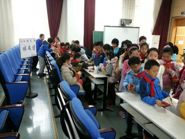 活动紧密结合学科教学内容,符合学生心理特点。本着使语文学科教学生活化、趣味化的原则,选择的内容丰富多彩,有猜字谜、课本剧表演、成语填空和古诗结龙,每个项目前都排了长长的队伍。有序的队伍中,能看到主动帮忙的志愿者、感受到小泡泡们专注的目光、听到孩子们爽朗的笑声……