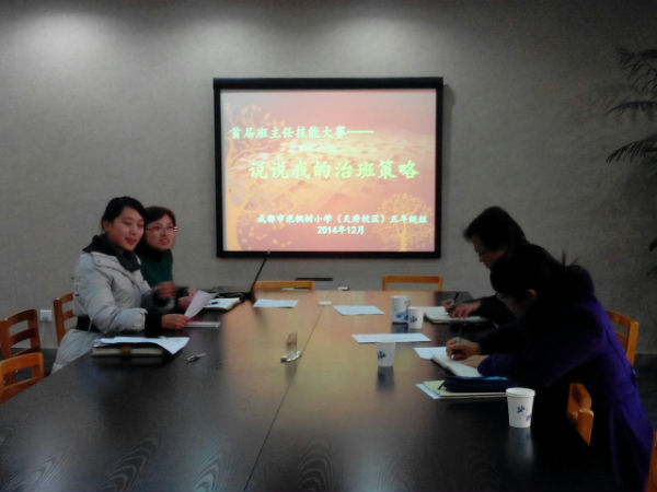 十二月十六日,五年级全体班主任在小会议室举行了班主任治班策略比赛。会议由何庆华老师主持,苟鹏校长和欧小丽主任全程参与点评、指导。