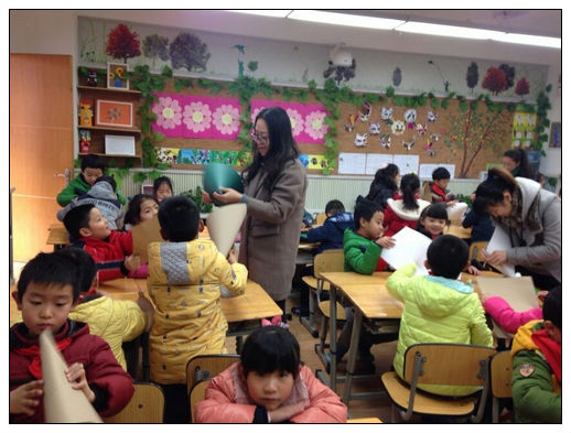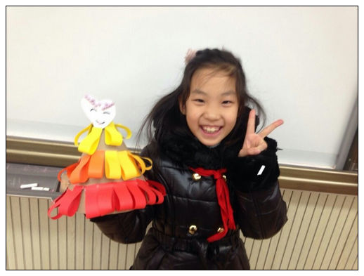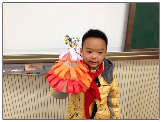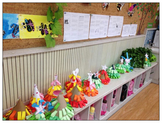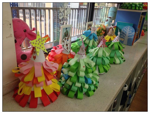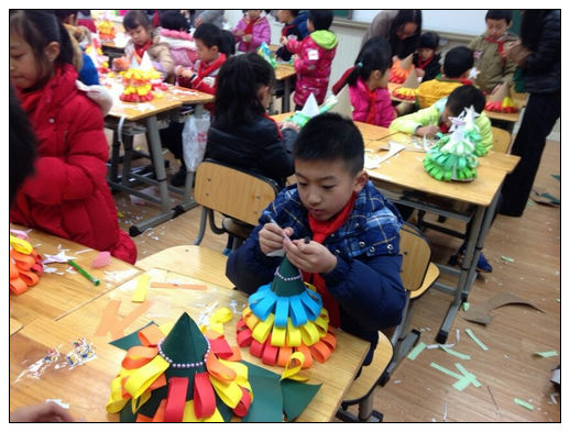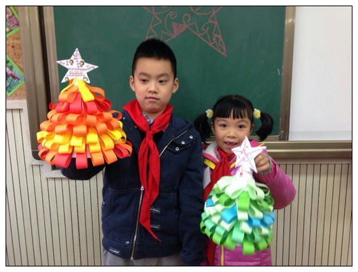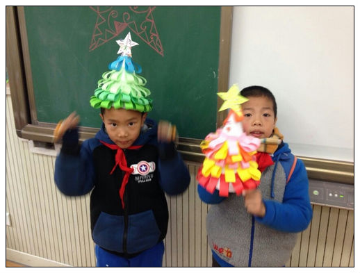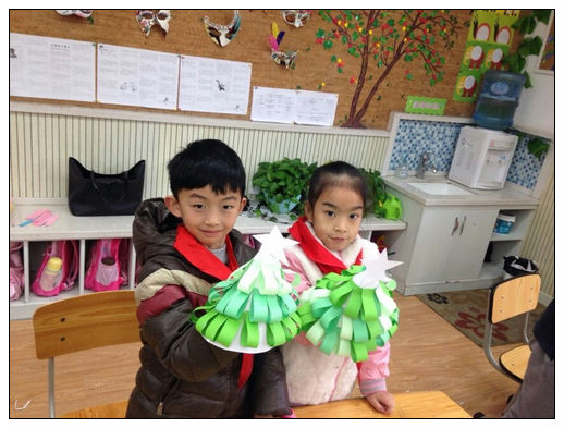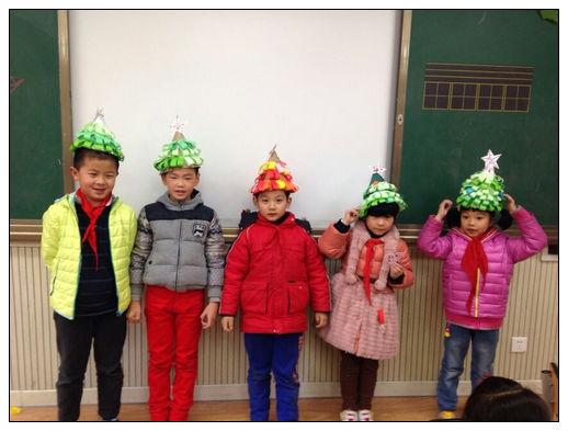 一会儿功夫,一个个小小的圣诞树就变了出来,红的、绿的不拘一格。小小的圣诞树“种”在孩子们头上,脸上笑开了花。小小的圣诞树“种”在教室里,树上闪耀的那颗星是孩子们纯正的童心。