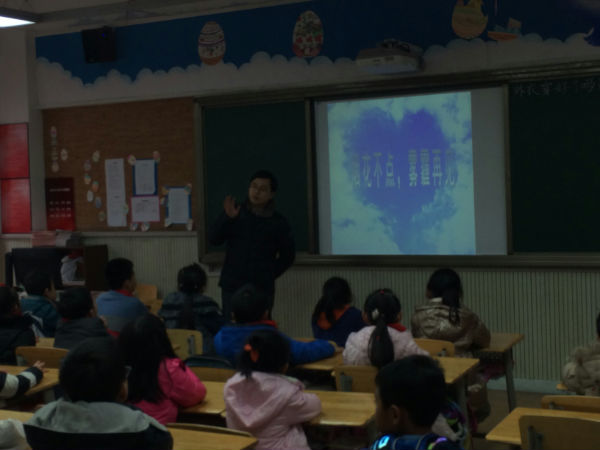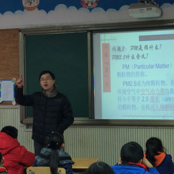 杨蕊郗爸爸主动请缨,给孩子们带来主题为“烟花不点 雾霾再见”的环保知识讲座。杨爸爸以生动形象的语言,图文并茂地向孩子们讲述了什么是“霾”,“雾”和“霾”有什么区别。孩子们听得津津有味,杨爸爸随即抽学生回答,大部分孩子都能回答正确;随后,杨爸爸告诉孩子们雾霾对我们的生活有什么危害,包括:雾霾天气,可见度低,飞机延迟,雾霾进入人体,会导致各种呼吸道疾病,甚至引发癌症。最后杨爸爸倡议,希望同学们从我做起,从身边小事做起,低碳出行,分类垃圾,不燃放烟花爆竹等;并希望人人成为环保小卫士,共同维护我们的地球家园,使我们的生活更加美好。