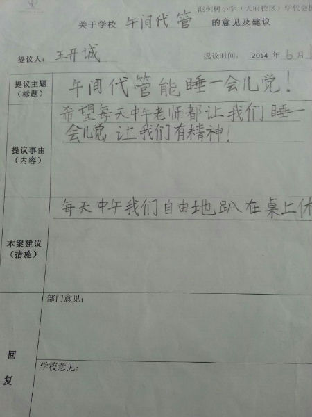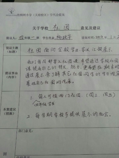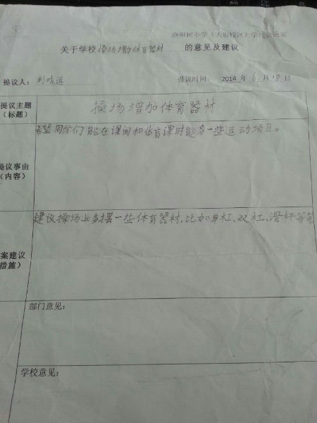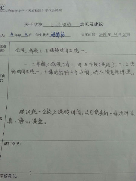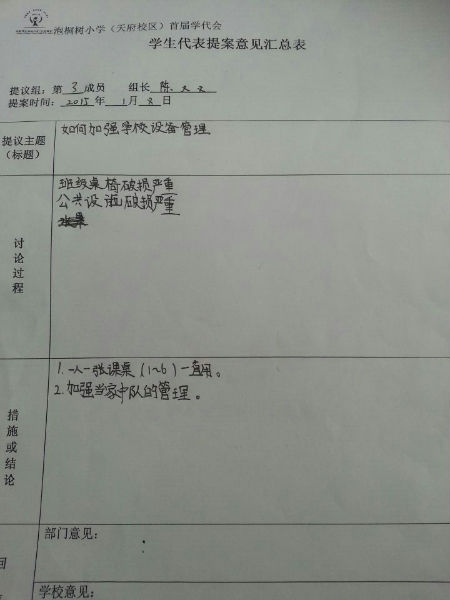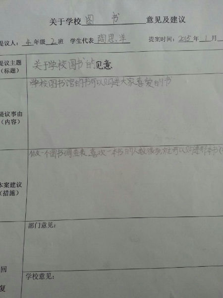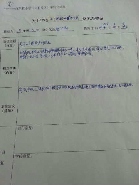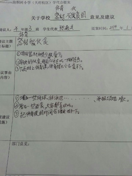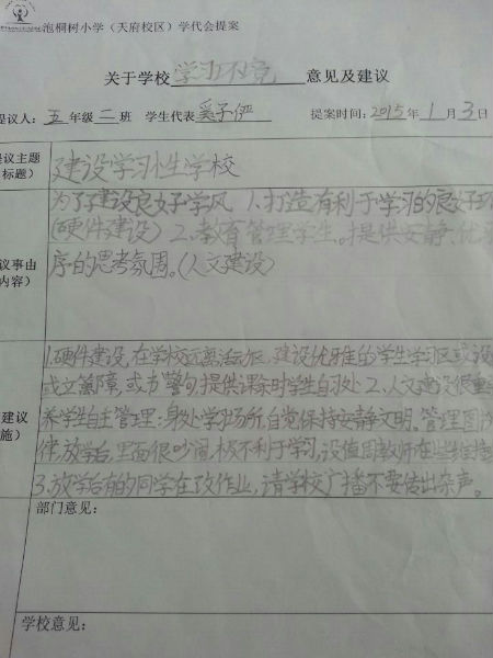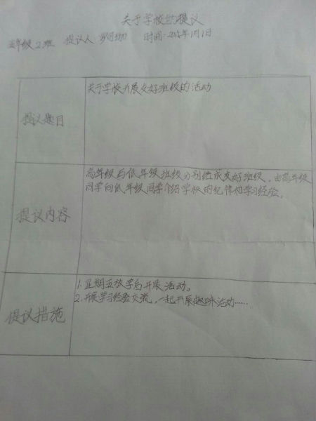 2015年1月8日下午,我校首届学生代表大会在多功能厅隆重召开。与会代表们纷纷献言献策,向学校提出了一些宝贵的建议和意见。以下是部分小组提案和部分学生代表个人的提案。