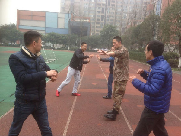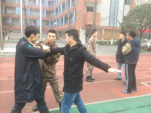 2015年1月16日下午,在唐俊峰校长的带领下,我校男老师接受了成都军区四名教官的培训,他们通过实战训练,器械训练让我们看见军人的风采,最主要的是让我们学习了在遇到危机时,该如何擒住对方,保护好我们这群可爱的小泡泡们。