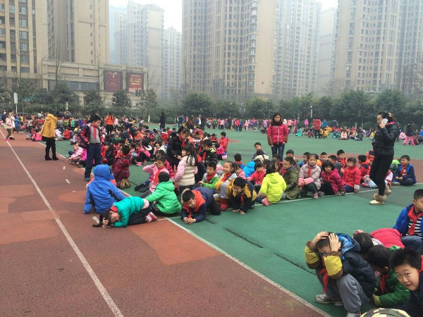 在平时我们训练有序下,地震来临,我校师老师们带领学生安全迅速的撤离了教学区。