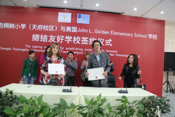 首先,由芶鹏校长致欢迎词,芶鹏校长代表学校欢迎来自美国John L. Golden Elementary School学校的教育同仁,希望双方以今天为起点,进一步深入交流与合作,为双方的孩子和老师搭建更广阔的交流平台,共同促进双方学校的发展。Sherry Aarmean校长表示,感谢芶鹏校长和全体老师的热情接待,泡桐树小学天府校区是一所很有中国特色且非常具有教育国际化氛围和视野的学校,期待双方在签约后能够相互学习,促进双方教学理念、教学方法的交流与合作。