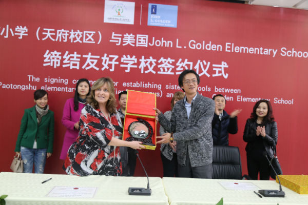 2015年3月18日——3月19日,美国洛杉矶John L. Golden Elementary School学校Sherry Aarmean校长和资深教师Angela Adez女士一行两人访问泡小天府校区,我校芶鹏校长、唐俊峰、陈冠夫副校长、以及黄子华、侯文婷、李世涛、李瑶等老师一起接待了来访嘉宾。