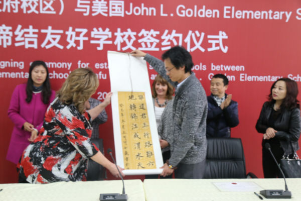 随后,开始签约环节,芶鹏校长代表泡小天府校区和Sherry Aarmean校长在协议书上郑重的签下了校长的名字,在庄重的签约仪式后,双方交换协议书文本并合影留念,芶鹏校长代表学校向Sherry Aarmean校长赠送校礼——我校三年级王可可同学的书法作品,签约仪式在现场师生热烈的掌声中结束。
