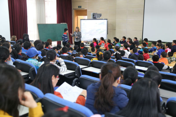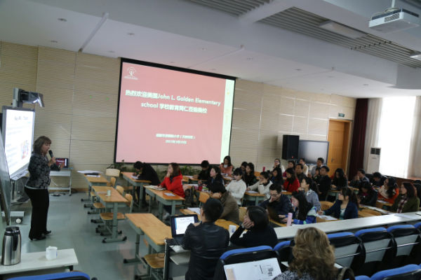 19日上午,由John L. Golden Elementary School学校资深教师Angela Adez老师在阶梯教室为我校50余位老师做了主题为《合作学习的方法与策略》的演讲,演讲中详细阐述了合作学习的组成形式、人员结构、小组内分层互动学习、活动形式、内容设置的逻辑以及评价等知识,向泡小天府校区的老师们介绍了美国学校的教育理念和教学方法,为我校老师了解美国教育现状、进一步促进国际理解教育奠定了知识基础。