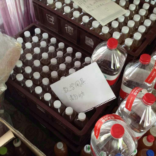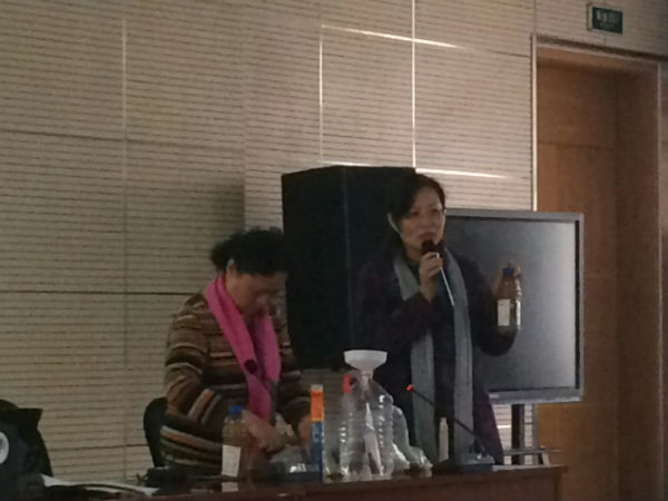 接着志愿者用现场展示了环保酵素的做法,采用红糖:鲜垃圾:水=1:3:10的比例装入可密封的塑料容器,关紧瓶口,发酵3个月(第一个月每天要稍微打开瓶盖放气),我们的环保酵素就做好了。