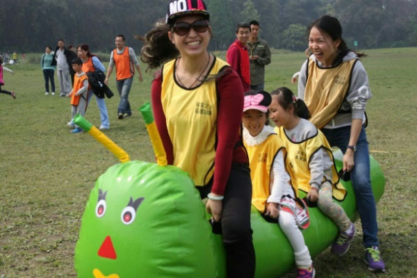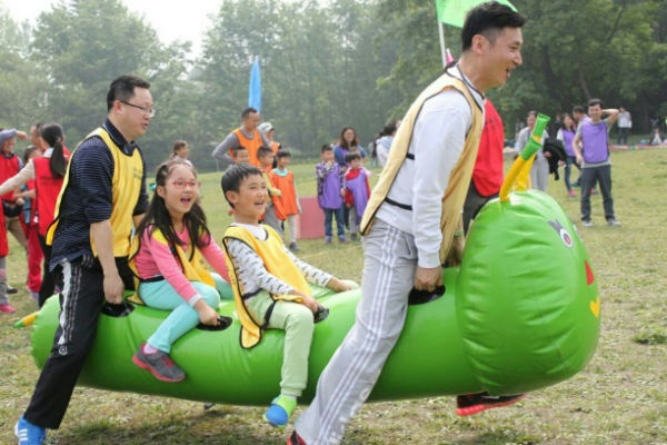 首先开始的是“疯狂毛毛虫”,每个小队选出三组人员,接力上阵,哪个小组最先冲到终点,就赢得本次比赛。只见孩子们坐在巨大的毛毛虫上,爸爸妈妈们使出了吃奶的劲儿,拖着他们拼命往前冲,乐得孩子们哈哈大笑。不过,这可不是简单的体力活哦,在短短的准备工作时间里,有的小队还聪明地根据“田忌赛马”的经验,选出了本队三次上场人员的最佳组合,最终取得不错的战绩!