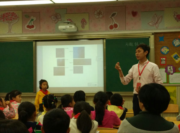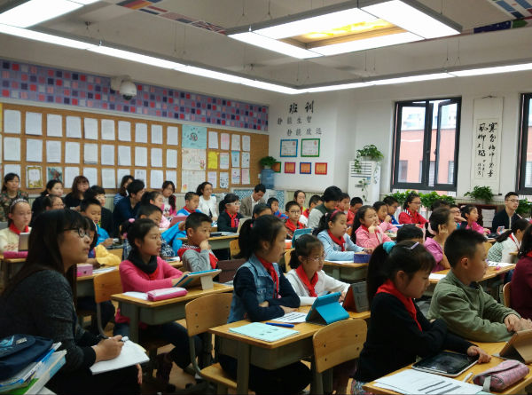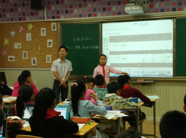 首先由唐治国和赵靖两位老师呈现了两节精彩的数学课。唐老师执教五年级《分数除法二》、赵靖执教三年级《认识分数》。两位老师都运用了翻转理念,让孩子们课前学习了微视频,记录下自己的收获和困惑。课中,孩子们首先分享了自己的收获,并通过小组交流、全班分享来解决困惑,达到对知识理解。在巩固应用环节,在孩子们完成学力单相应习题后,一改往日在黑板抄或实物投影的方式,老师充分应用了“一对一数字环境”让孩子们拍照上传自己的习题进行分享。还运用数字平台的选择、统计功能进行判断题、选择题的练习,老师根据统计的数据进行分析,实时掌握孩子们的学习状态,调整教学。