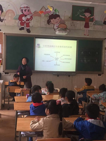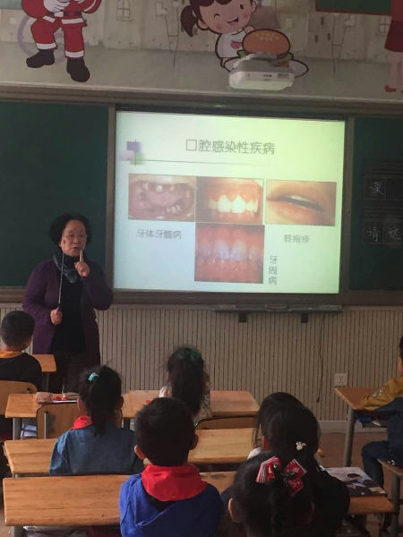 在有限的30分钟时间内,伴着精心准备的PPT,肖奶奶深入浅出的给小泡泡们上了一堂洁牙护牙的知识课,从”微生物“这样抽象的概念到常见的口腔感染性疾病,从牙齿的构造到细菌小部队的侵袭,从口腔疾病的早期预防到具体的护牙常识,肖奶奶都娓娓道来。课堂上,小泡泡们被这些新奇的知识所吸引,他们不断的发问,外婆也都耐心的一一作答。