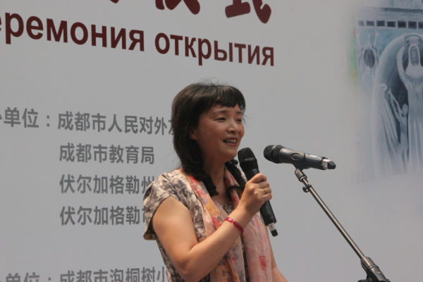 随后,由成都市人民对外友好协会秘书长赵玲女士致辞,赵玲秘书长首先祝贺了参加本次青少年书画作品展获奖的同学,希望大家立足成都,用艺术的方式表现成都的风土民情,在对外交流中传递中国的声音。赵玲秘书长向与会领导及师生们介绍:2011年,成都市与伏尔加格勒市结为友好城市,双方在文化、艺术、经贸、旅游等方面展开交流,配合本次展览,成都市的小记者团队也应邀赴俄罗斯参加交流,双方通过交流,相互了解,共同发展。最后,赵玲秘书长感谢成都市教育局、成都市教科所、成都市泡桐树小学(天府校区)为承办本次活动给与的支持与帮助。