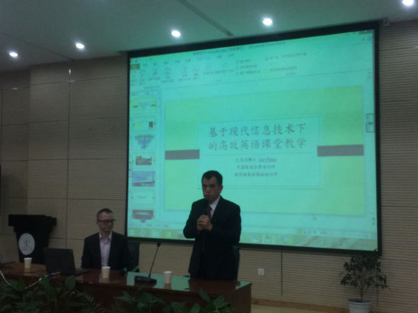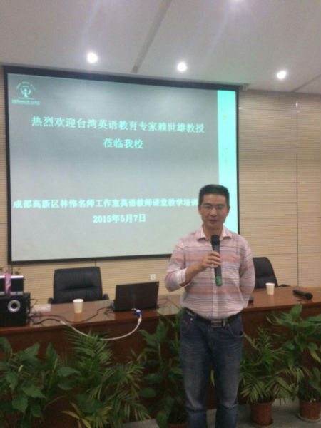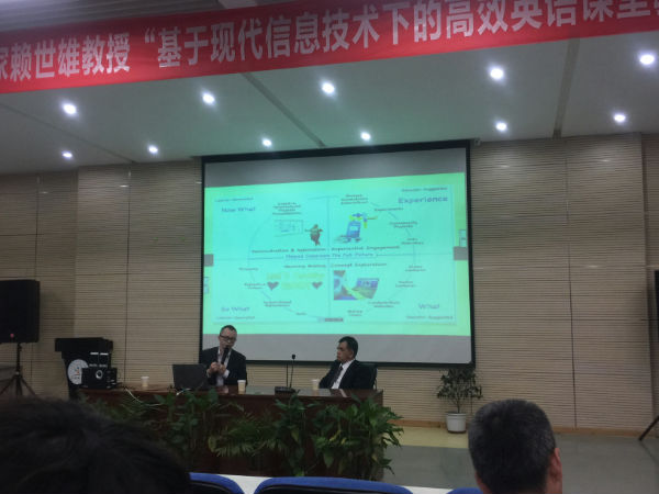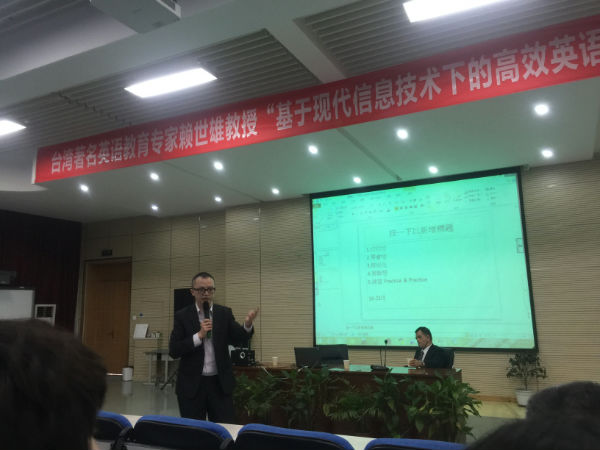 此次活动特别邀请到了台湾著名英语教育专家赖世雄教授、王兆鸿博士。赖世雄教授,系海峡两岸英语教育领域的著名专家,他分享了自己发奋学习英语,终能自学成功的经验,如描述法,翻译法等。王兆鸿博士从事英语教学近20年,他分享了如何教好英语的一些心得,介绍了国际上的一些教学理念如杜威(Dewey)的“从做中学”(learning from doing)、革新的教学模式如翻转课堂(the flipped classroom),并使用网络、软件、教学视频等资源与现场参会教师互动,生动地展示了如何在英语教学中应用现代信息技术进行辅助教学。