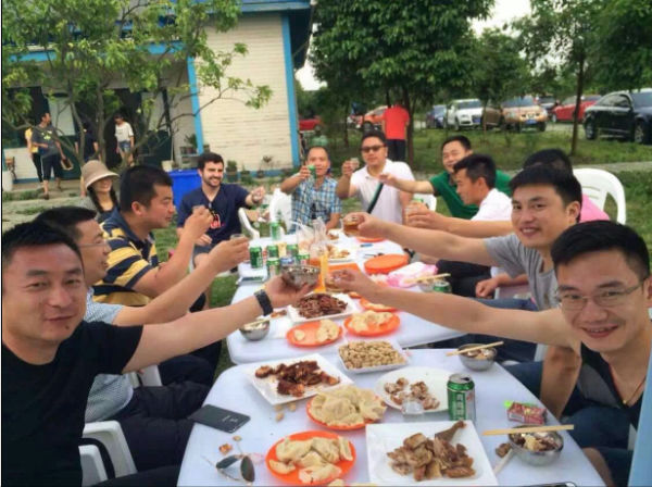 丰盛的晚餐,大家围坐在一起,共同举杯,友谊万岁!