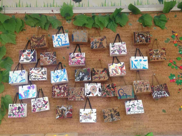 最后,完成的作品,我们把它挂在教室里进行展示,这些漂亮的口袋,成为了教室里一道靓丽的风景。宝贝们看到自己的作品把教室打扮得更漂亮,心里充满了自豪。