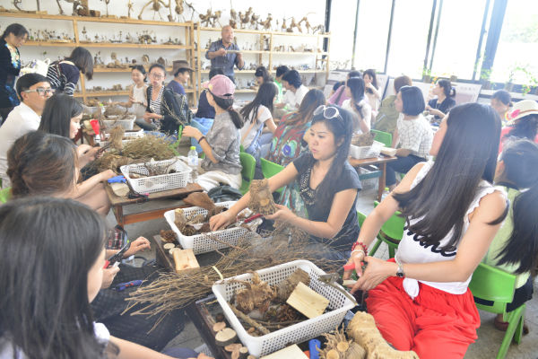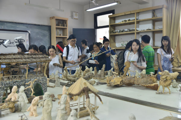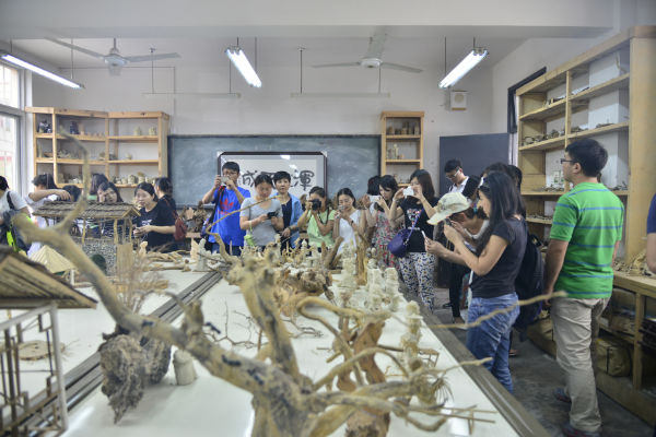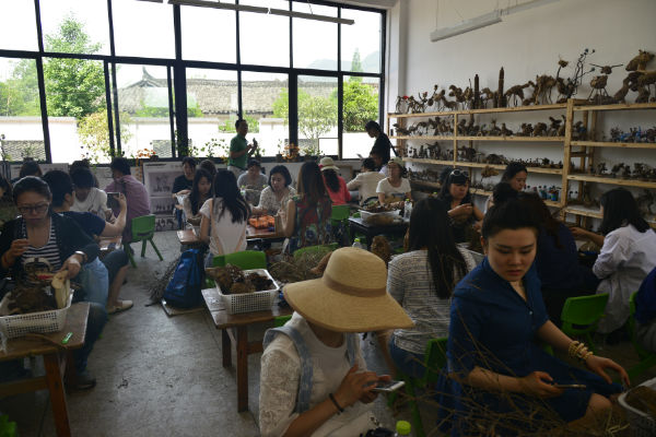 随行的美术教师团队在陈冠夫副校长的组织下,对高何红军小学的根艺作品进行了现场体验,本着体验、交流的目的,老师们在认真体验根艺材料、制作方法及造型特点后,创作出了一大批造型独特、精彩纷呈的根艺作品,大家在体验结束后也就体验的经验跟红军小学高利老师进行了探讨,并在具体的美术造型方面给出建议;体验结束后,老师们参观了四川省特级教师刘文君老师的陶艺工作室。