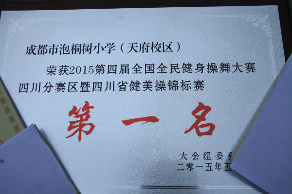 成都市泡桐树小学(天府校区)健美操队42名队员组成的7支参赛队在熊天军老师的带领下参加了本次比赛,并荣获全国全民健身操舞大赛(四川分区赛)小学组4个一等奖,1个二等奖的优异成绩。同时,由10位小朋友组成的2支竞技健美操参赛队,首次参加四川省健美操锦标赛,并一举夺得竞技健美操?五人操项目小学组第一名和第二名的优异成绩。