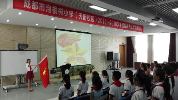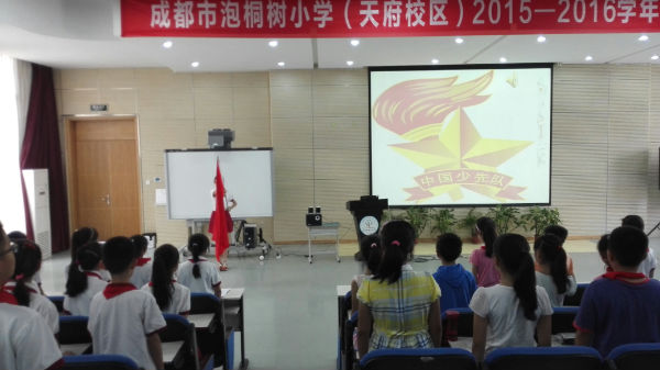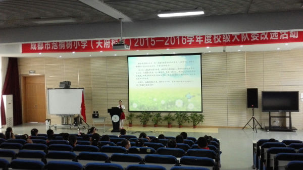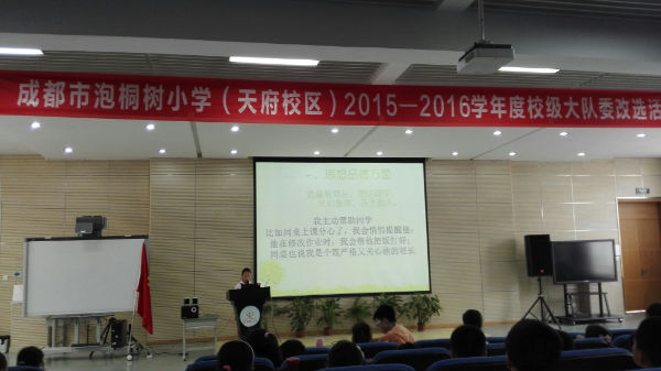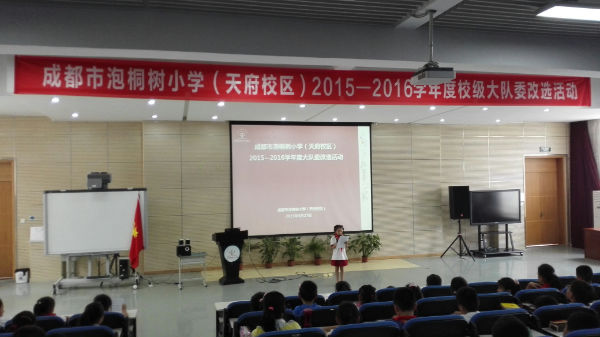 成都是泡桐树小学(天府校区)2015—2016学年度大队委选拔于2015年5月27日中午1点在学校多功能厅隆重举行,32名大队委候选人、31名学生评委以及学校大队辅导员参加本次选拔工作,通过投票的方式最终产生本届校级大队委干部。