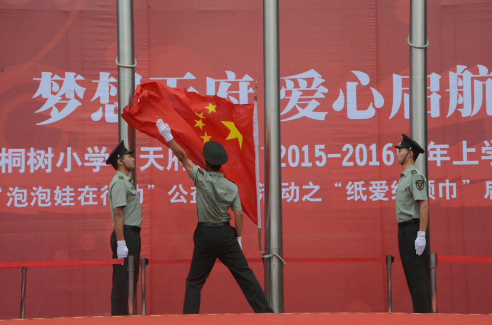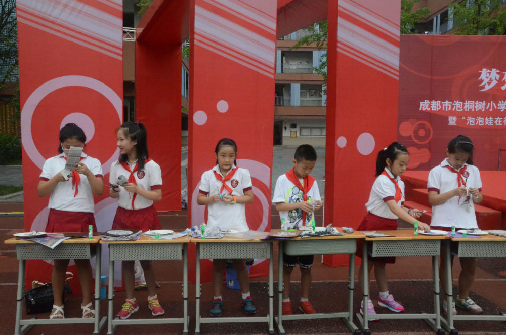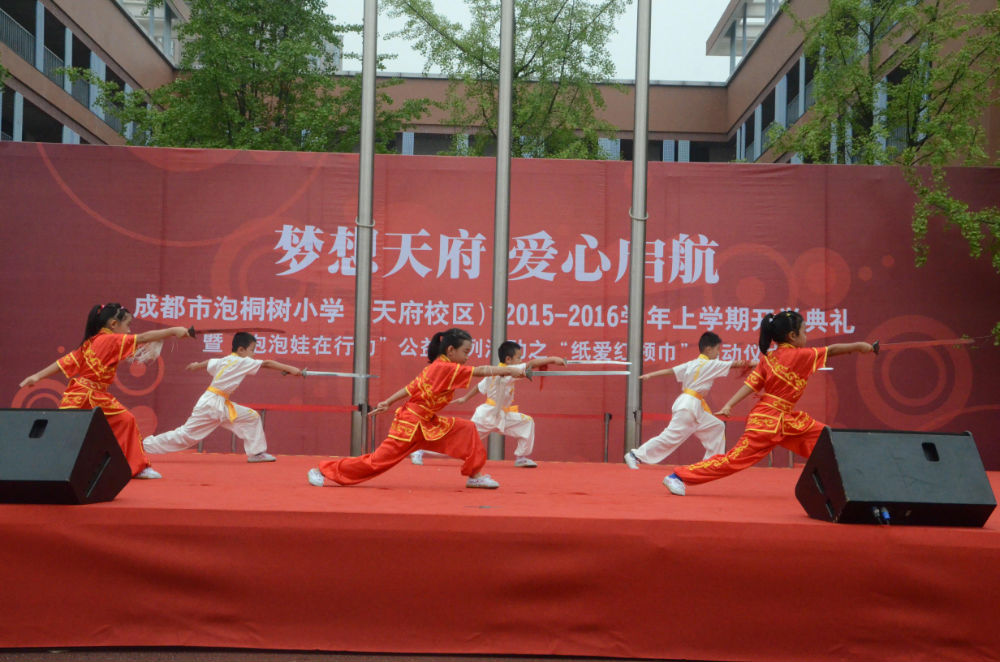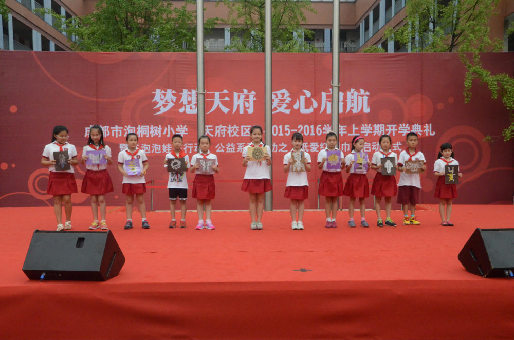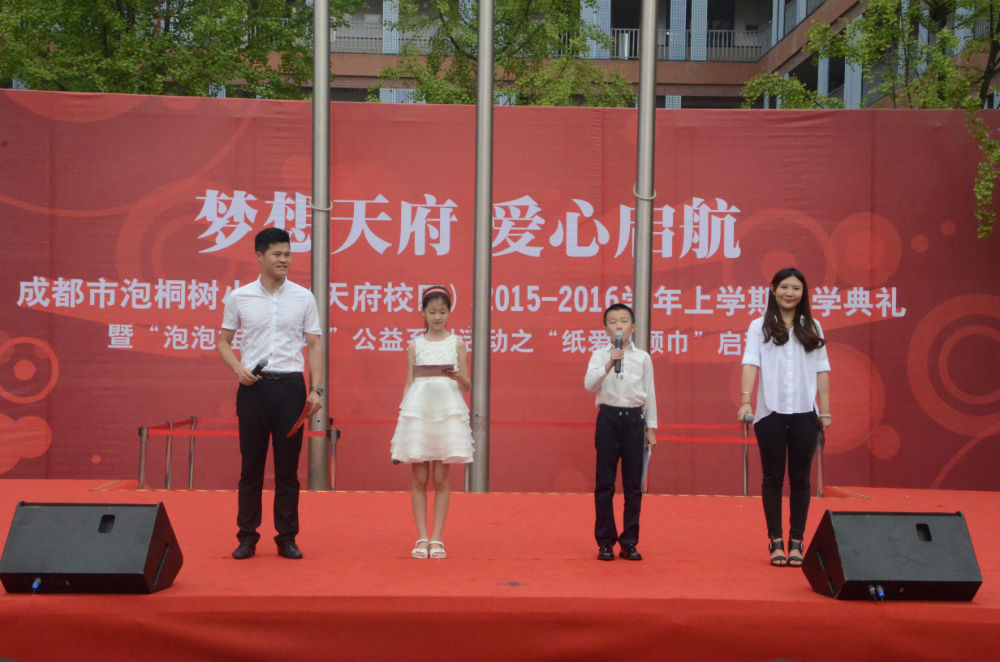 2015年9月1日上午9:00,成都市泡桐树小学(天府校区)迎来了490多张稚嫩的脸庞,全体师生齐聚操场,以饱满热情的精神状态迎来了新的学期,并举行了隆重和热烈的开学典礼暨“泡泡娃在行动”公益系列活动之“纸爱红领巾”启动仪式。四川省团委少年部部长安玲、成都市团委少年部部长谢瑾、成都市团委少年部副部长舒婧、高新区少先队总辅导员安伟受邀参加了此次活动。其中,安玲部长亲切地与孩子们问候,并提出了新学期的新要求、新希望,表达了对泡天未来的美好憧憬。