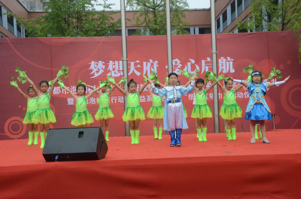 我校邀请了三位部队军官协助升旗,他们迈着整齐的步伐,将鲜艳的五星红旗冉冉升起,在雄壮激昂的国歌声中,此次活动正式拉开序幕。健美操队的小朋友们首登舞台,带来了热闹的开场舞蹈《大眼睛》,呈现出了泡天的生机与活力。接着,表演唱社团的同学们带来了环保音乐剧《森林爷爷》,呼吁大家保护环境,做一个环保小卫士。还有一群手工社团的小朋友从活动开始一直在台下剪纸,用实际行动变废为宝,并将自己的剪纸作品进行展示。然后,四川省少年儿童基金会的工作人员向全校师生介绍了我校上学期义卖活动所筹得善款的用途和去向,随后主持人宣布启动“纸爱红领巾”公益活动,说明“纸爱红领巾”是将搜集的废旧报纸、图书等变卖,将募集的款项购买树苗,种一片红领巾树林,并倡议广大少先队员们积极参与环保活动、树立绿色环保意识。