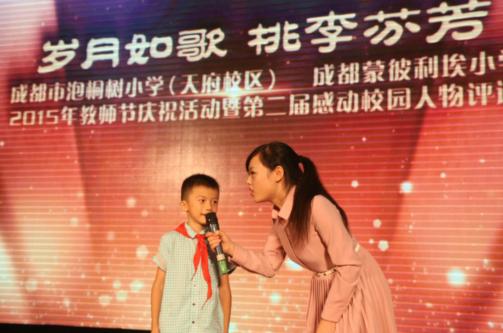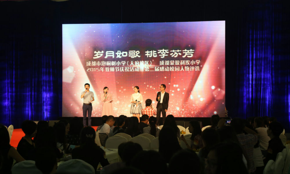 锦城湖畔,秋雨微洒。忆往昔,风雨兼程岁月如歌,看今朝,泡天蒙小桃李芬芳!2015年9月10日下午,成都市泡桐树小学(天府校区)、蒙彼利埃小学2015年教师节庆祝活动暨第二节感动校园人物颁奖在学校体育馆隆重举行。