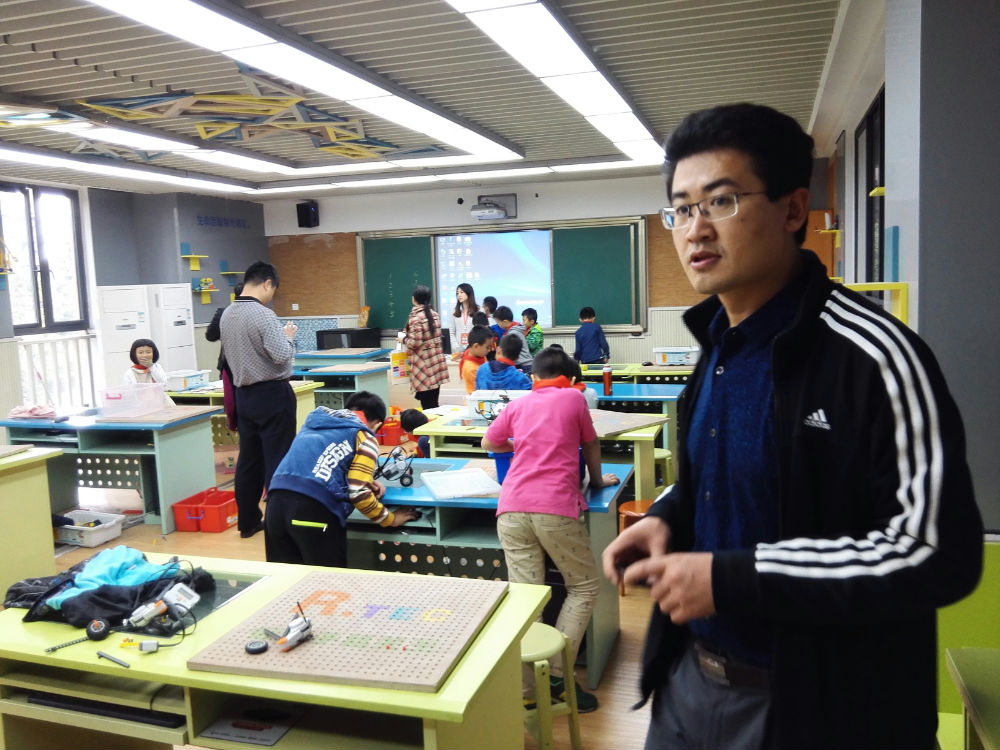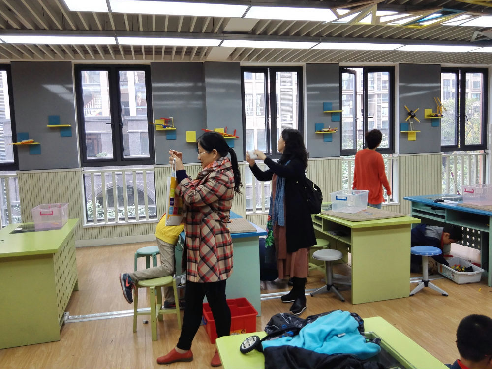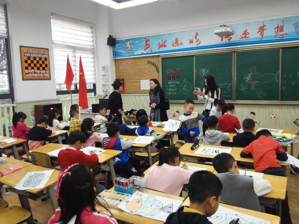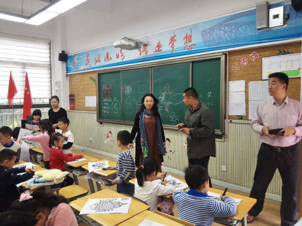 李世涛老师带领来访嘉宾走进了课堂,与一年级正在上美术课的孩子们进行了互动,孩子们大方的与远道而来的客人交流,高兴地介绍了自己正在创作的作品;随后李老师引导嘉宾们参观了正在展出的邮票展览,并分别参观了学校的楼梯文化,在交流中,李老师向各位嘉宾介绍了学校在打造欧洲、美洲、非洲、江南民居、窗-皮影文化等主题楼梯的整体思路,把每个楼梯承载的国际理解教育的目的介绍给了来访嘉宾,其中借助皮影的表演原理,通过自然光让中国古典的经典故事用图案展示出来的实践成果,其科学性、艺术性、趣味性得到了来访嘉宾的一致赞赏。