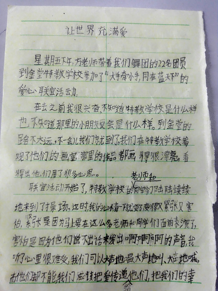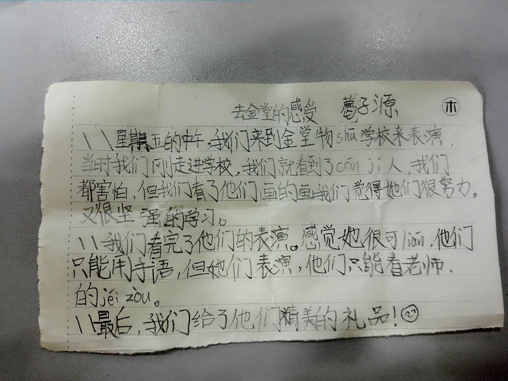 “我们歆想同一片蓝天,沐浴在阳光下。我们笑脸相逢,看着生活的美好。我和你一样,在蓝天的庇佑下健康成长。”作为这台小演出的压轴,金堂特教学校的孩子们表演了手语歌《和你一样》。台上台下,一起打起手语,孩子们收获着由自己发出而又反馈回自己的善意。