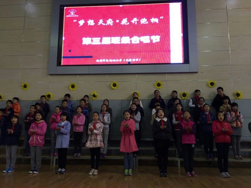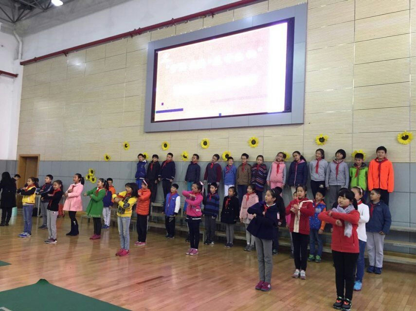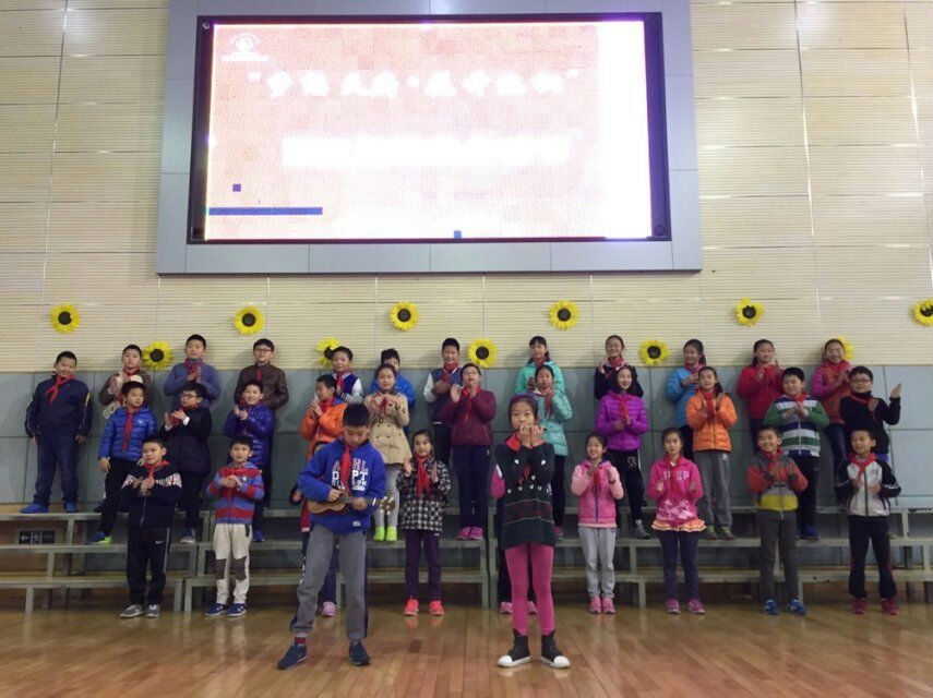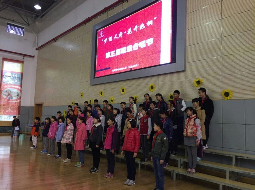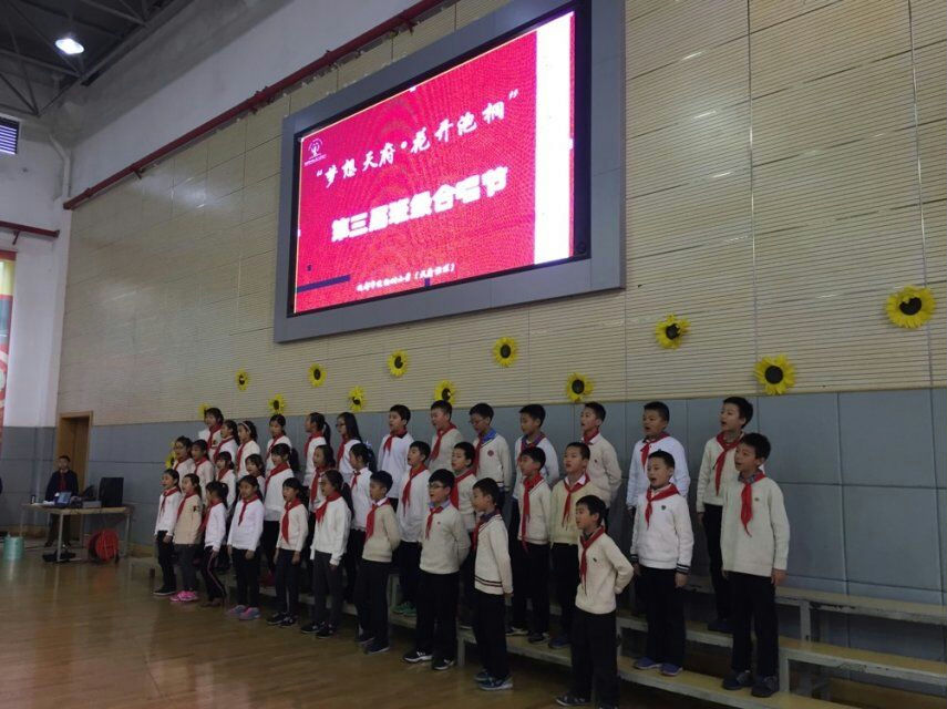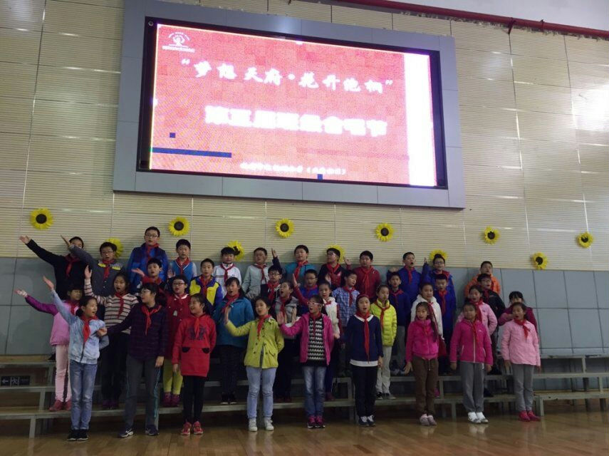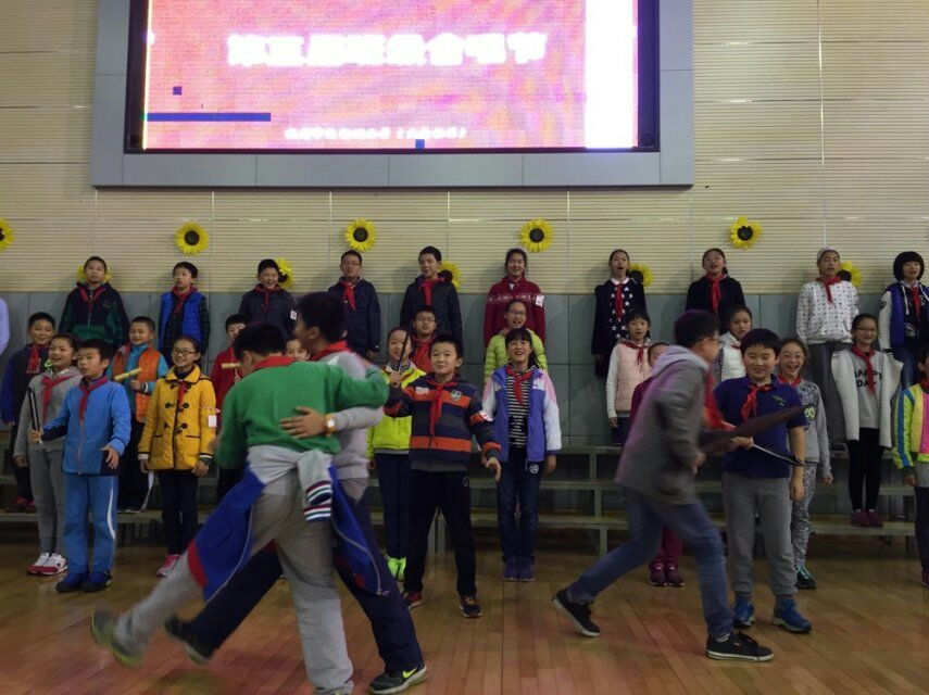 “起来,不愿做奴隶的人们,把我们的血肉组成我们新的长城,中华民族到了,最危险的时候••••••”豪迈、嘹亮歌声飘荡在体育馆,孩子们的笑脸洋溢着幸福、自信。2015年11月26日(本周星期四)下午13:10,准时开展了本次合唱节五六年级展示活动。