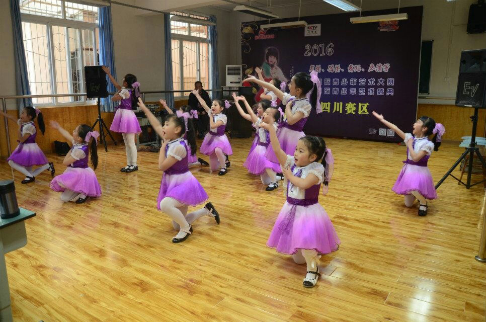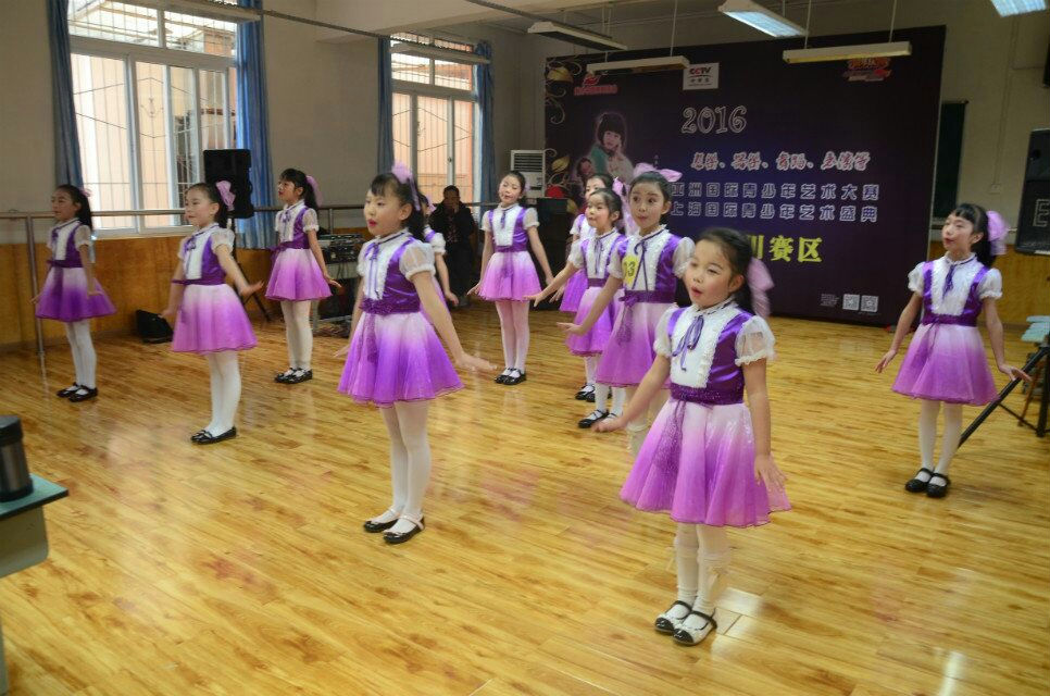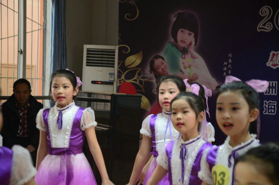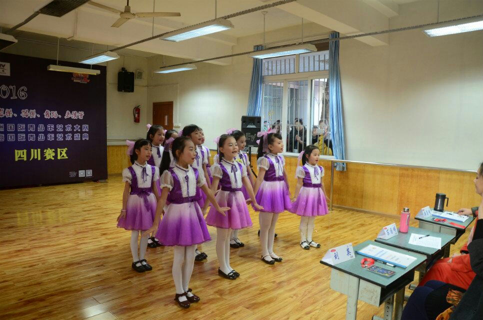 终于到了第一个表演的节目了,一群身穿紫色连衣裙,头戴蝴蝶结头纱的小精灵们轻盈地跑进考场,她们面带微笑,熟练地演唱着那曲动人的《山青水长流》,紫色的衣裙随着优扬的歌声飘动,仿若一群快乐的小仙子们在欢唱!小演员们精彩的表演赢得场外观众的阵阵喝彩!