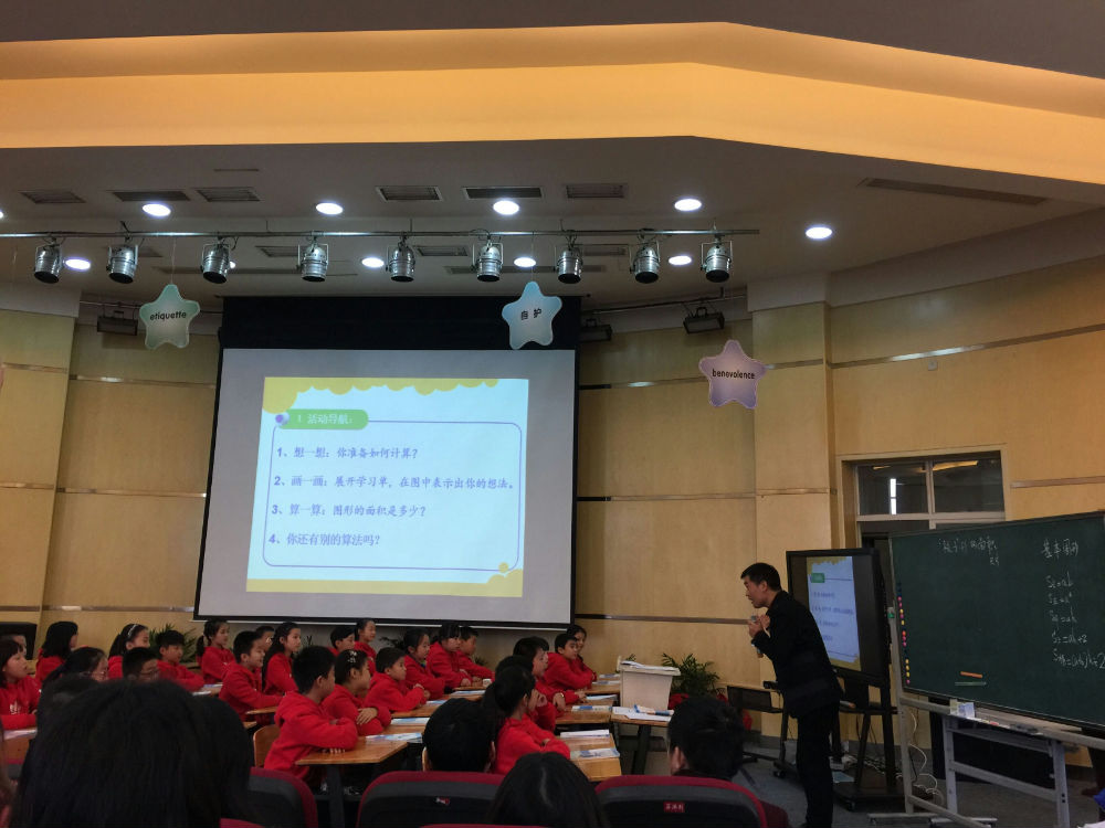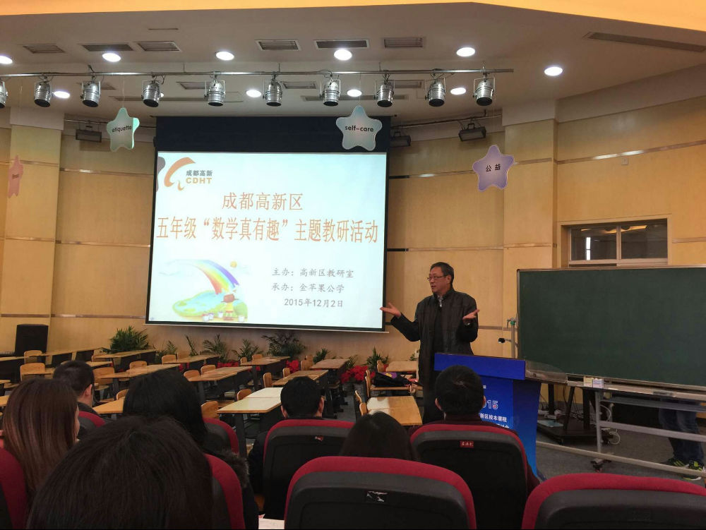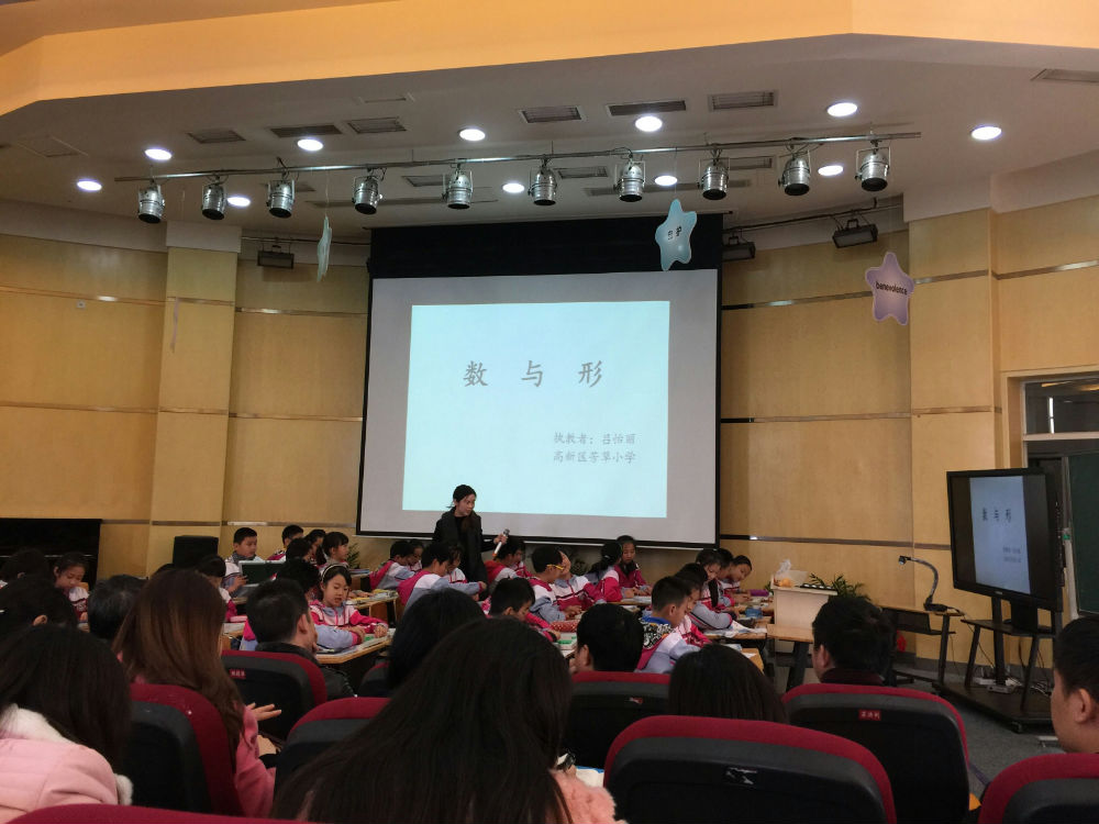 然后由成都市小学数学教研员张碧荣老师和成都市小学数学特级教师闫小雄做指导。我校的廖敏老师积极与专家互动,指出课堂的问题设计和学具运用都能让数学好玩。张老师指出,数学好玩除了受知识本身、数学方法、年龄段特征影响之外,影响最大的是我们的数学老师,特别的数学老师与学生的情感,这是眼中有人的教育的真切体验。闫老师用十八个字“形成几何直观、研究空间形式、培养空间观念”指出空间与图形教学模块的方针。研究组合图形的面积一定得让图形带着尺寸走,并列举了几个案例,让老师们受益匪浅。
