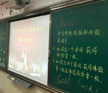 为了迎接这次活动,英语组进行了精心准备,侯文婷老师带领全组人员商量了上下午活动的具体流程,人员分配,用具分发,志愿者培训和体验室的布置。星期四下午,英语组老师们将精心制作的ppt拷到电脑上,并将具体规则和温馨提示语写在黑板上,教室里充满了节日的温馨气氛。