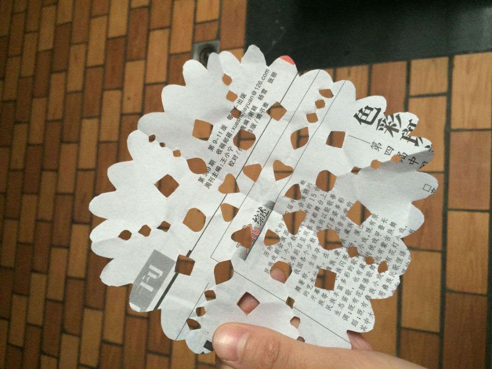 看,在剪纸体验活动中,小泡泡拿着剪刀,认认真真的将剪刀化作画笔,把手中简单的报纸变成了漂亮的图画,有小树、小蝴蝶、花朵。小泡泡拿着自己完成的作品,心满意足,别提有多高兴了。