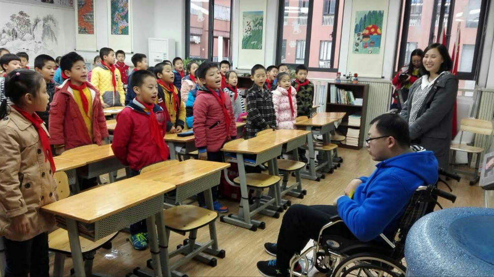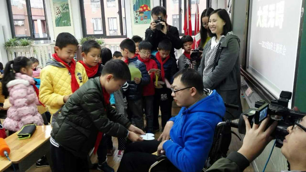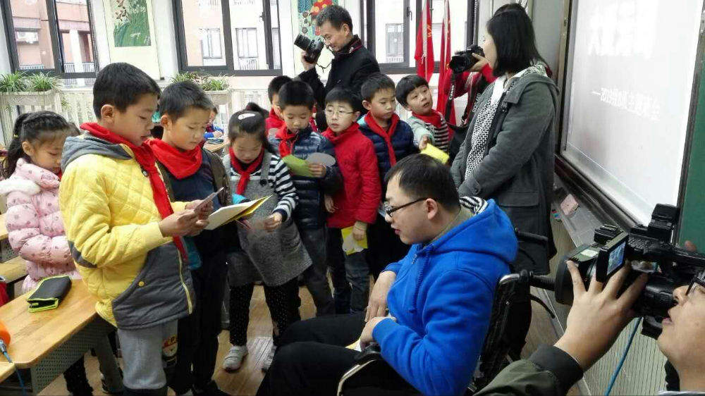 2015年12月4日,三八班组织开展了一次主题班会。一名特殊的客人,参加了这次主题班会。他坐着轮椅进入教室,说话迟缓而费力。