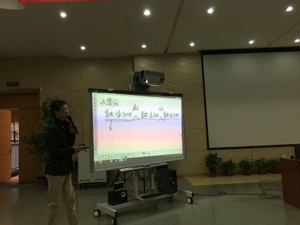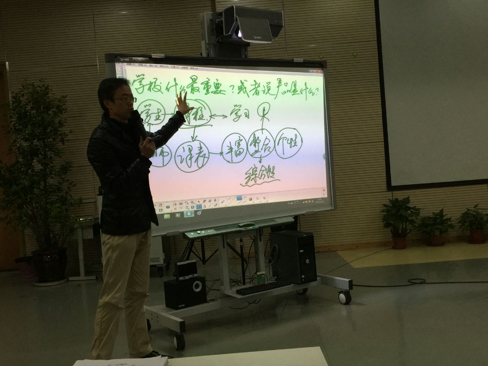 培训会之前,芶校长整顿了会风,明确了尊重每一个发言者和做好会议记录的两大原则。培训从关键词“九零后”开始,让老师们明白我们已经进入了“独生子女(90后)教独生子女(80后)的独生子女(00后)”时代,我们应该抱着怎样的姿态进行教育教学。从而引出“家”、“心理”、“专业”、“师德”四个主题词,“家”和“心理”构成了一个人的价值观,如果专业再好,价值观不到位,专业就会无用,正所谓“无德有才是毒品”,强调了师德的重要性。结合我们学校,提出“对得起每一个孩子的发展”是师德的重要体现,每一位老师都要认清自我,安人修己。接着,芶校长提出问题:“学校什么最重要,或者说产品是什么?”让老师们思考,指出学生成长的基石是“课程”,平等对待每一门学科,课程的三个特性——丰富、整合、个性,希望我们每一位老师树立大课程观,从自己就是一门课程开始,整合课程资源,为学生的发展保驾护航。