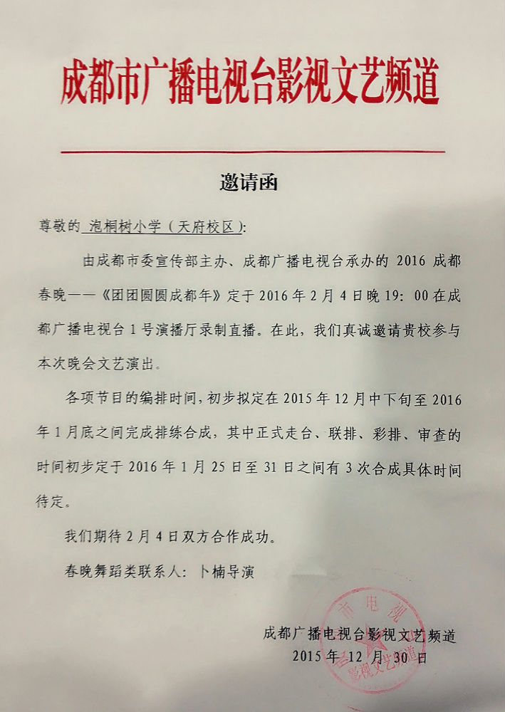 水泡泡·舞团再次受到成都市广播电视台影视文艺频道邀请——参加2016成都春晚《团团圆圆成都年》录制直播!