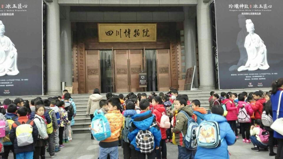 为了丰富同学们的课外知识,12月31日上午,学校组织了一次游学活动,三年级去往的地点是四川省博物馆。上午9时,同学们在老师的带领下乘大巴车赶往目的地。