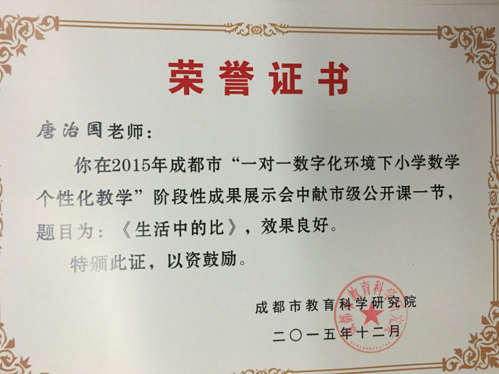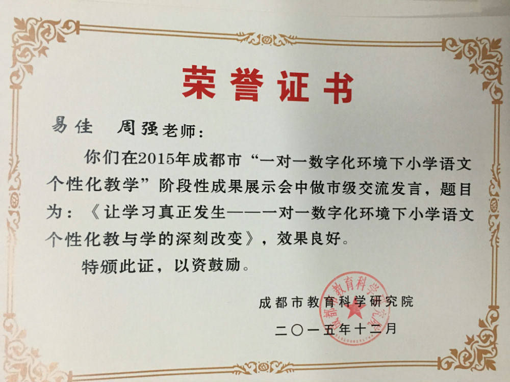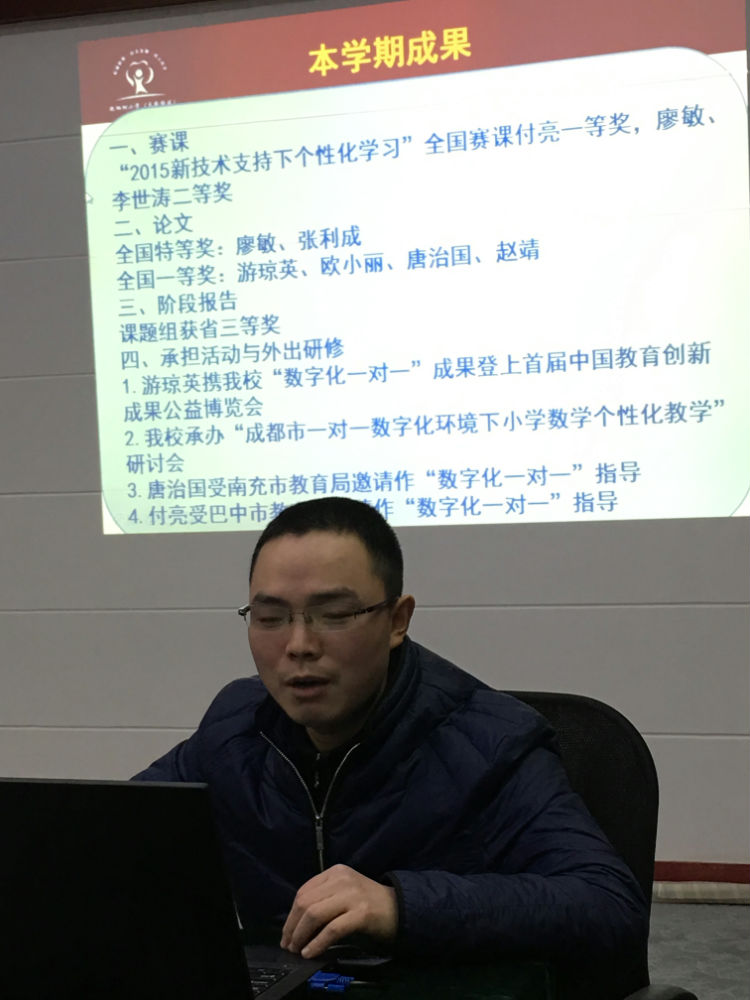 1月21日下午,成都市“一对一数字化环境下课堂个性化教与学研究”2015年度课题研究总结会在成都市教育科学研究院举行,参与此项课题研究的各所学校均派代表到场,我校付亮老师参与会议并做了我校课题研究的阶段总结汇报。